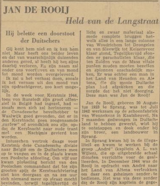 licht en zwaar materiaal alsmede complete bruggen hetwelk alles in een lange colonne van Woudrichem tot Drongelen en van Sleewijk tot Keizersveer klaar stond. Tegelijkertijd stonden er parachutisten klaar, die ten Zuiden van de Maas vitale punten zouden moeten bezetten en spionnen onschadelijk maken. Er was echter een man in het Land van Heusden en Al» tena, die dit mooie Duitsche plan had afgekeken en die zorgde dat het niet doorging. Deze man was Jan de Rooij! Jan de Rooij, geboren 20 Augus tus 1923 te Sprang, was tot Juli 1942 werkzaam op de schoenfabriek van Wennekens in Kaatsheuvel. Na 7 maanden gedwongen in Duitschland te hebben gewerkt, wist hij te ontsnappen en dook onder bij zijn broer, een landbouwer in Sprang. In Sprang kwam hij in de illegaliteit en kwam te werken bij de groep ,,André" (kapitein A L. van Wijlen), die op uitgebreide schaal diensten verrichtte voor de geallieerden. In December 1944 was de Rooij in opdracht van André naar het Land van Altena vertrokken om daar een geheimen zender te bedienen. Het was via deze zender dat de Rooij zijn kapitein de gegevens