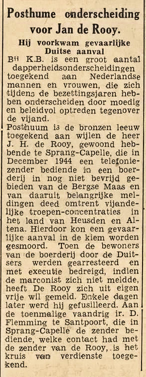Posthume is de bronzen leeuw toekend aan wijlen heer J. H. de Rooy, gewoond hebbende te Sprang-Capelle, die In December 1944 een telefonie zender bediende in een "boerderij in nog niet bevrijd gebieden van de Bergse Maas en van daaruit belangrijke meldingen deed omtrent vijandelijke troepen-concentraties In het land van Heusden en Altena. Hierdoor kon een gevaarlijke aanval in de kiem worden gesmoord. Toen de bewoners van 1de boerderij door de Duitsers werden gearresteerd en met exeeutie bedreigd, indien <1e marconist zich niet meldde, heeft De Rooy zich uit eigen vrije wil gemeld. Enkele dagen later werd hij gefusilleerd. Aan de toenmalige vaandrig ir. D.Flemming te Santpoort, die in Sprang-Capelle de zender bediende, welke contact had met de zender van de Rooy,. Is het kruis van verdienste toegekend.