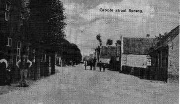 Het eerste huis links het latere PTT-kantoor, waar vroeger het Sprangse hoekhuis heeft gestaan. Daar tegenover (het eerste huis rechts) woonde Gerrit Groothuis. Achter de boom ernaast woonde de familie Quirijns. Aan de linkerkant (achter de fietsers) was de slagerij van Wout Nieuwenhuizen. |