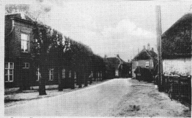De schoenmakerszaak van Toon en Janus Janson bevond zich in het tweede huis links achter de bomen. In het vierde huis achter de bomen links was de kapperszaak van N. van Ommeren gevestigd. |